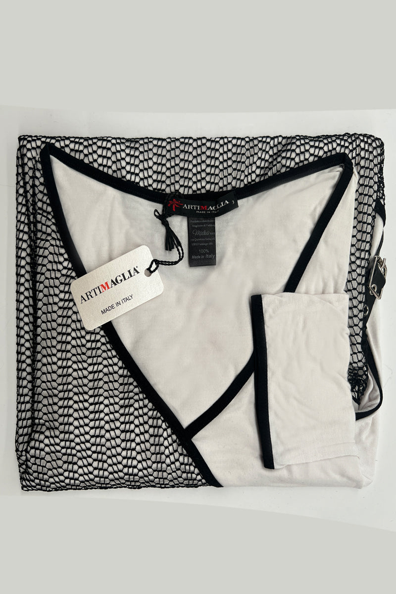 Maglia manica 3/4 in viscosa doppiata sul davanti con rete con dettaglio a cinturino. La viscosa a contatto con la pelle dona una piacevole sensazione di freschezza, simile alla seta.